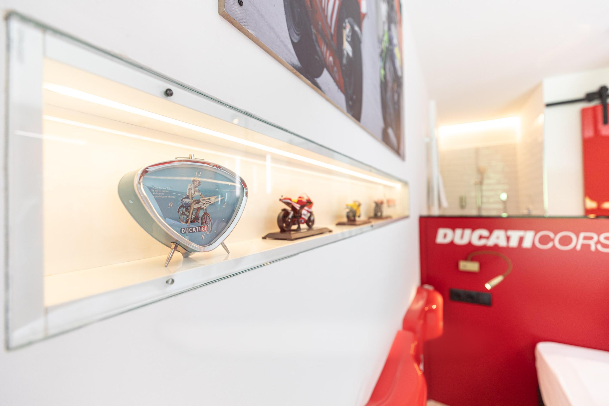 Speed. Sleek design. Elegant curves. And the greatest racing legends of all time. Ducati exudes a unique allure, one you’ll feel in every detail of this room. From custom-crafted design pieces and miniature models to the iconic Carl Fogarty racing suit in a limited edition, this is where your passion comes alive.