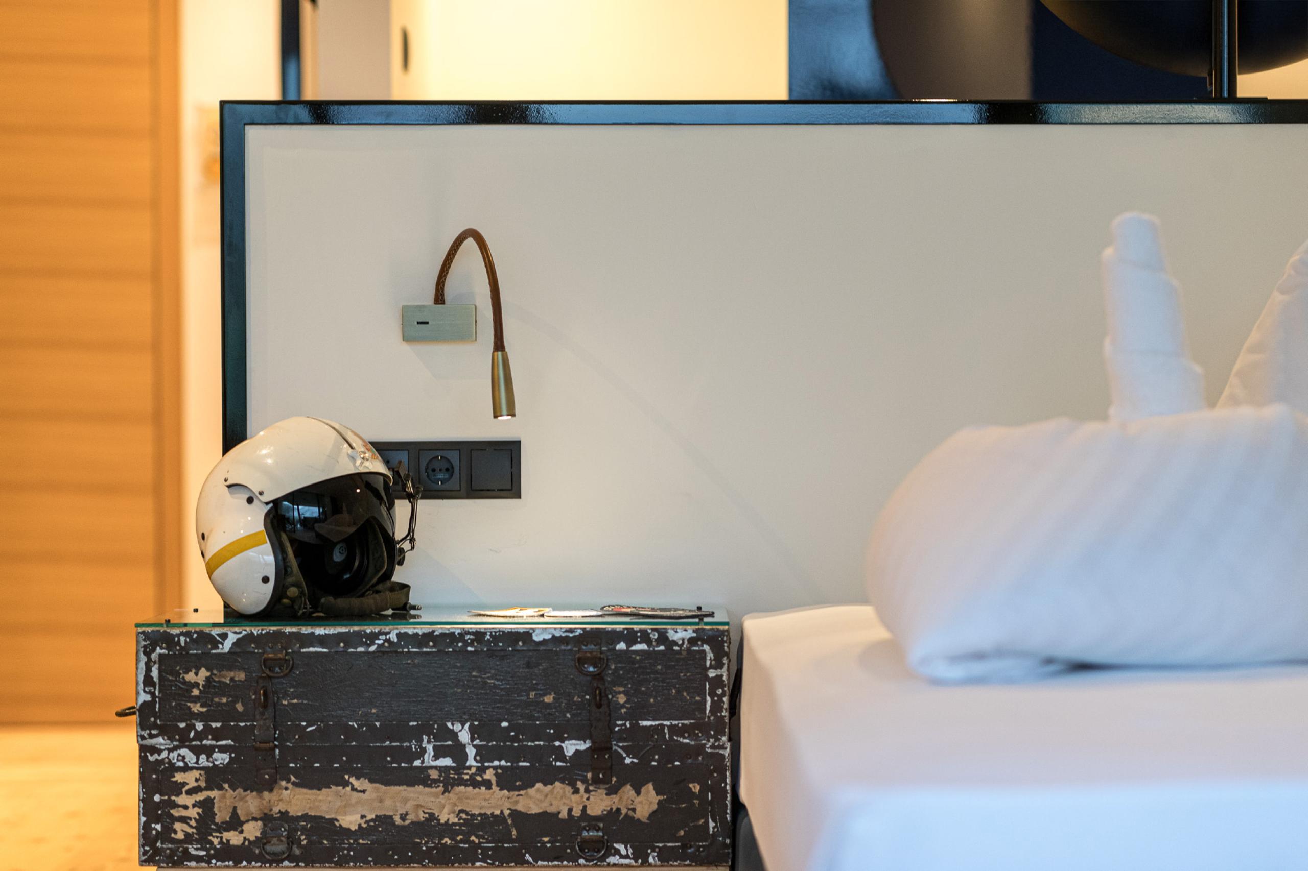 Una camera straordinaria dedicata alla punta di diamante dell’Al Plan Hotel: il Lockheed F-104S “Starfighter”. Negli anni Ottanta era utilizzato dall’Aeronautica militare italiana, oggi è sul balcone della vostra camera Aeronautica. Preparatevi a vivere un’emozione dopo l’altra tra elementi di design che celebrano le imprese della squadra aerea e modellini di caschi con le firme originali dei piloti. Un omaggio alla libertà del volo.