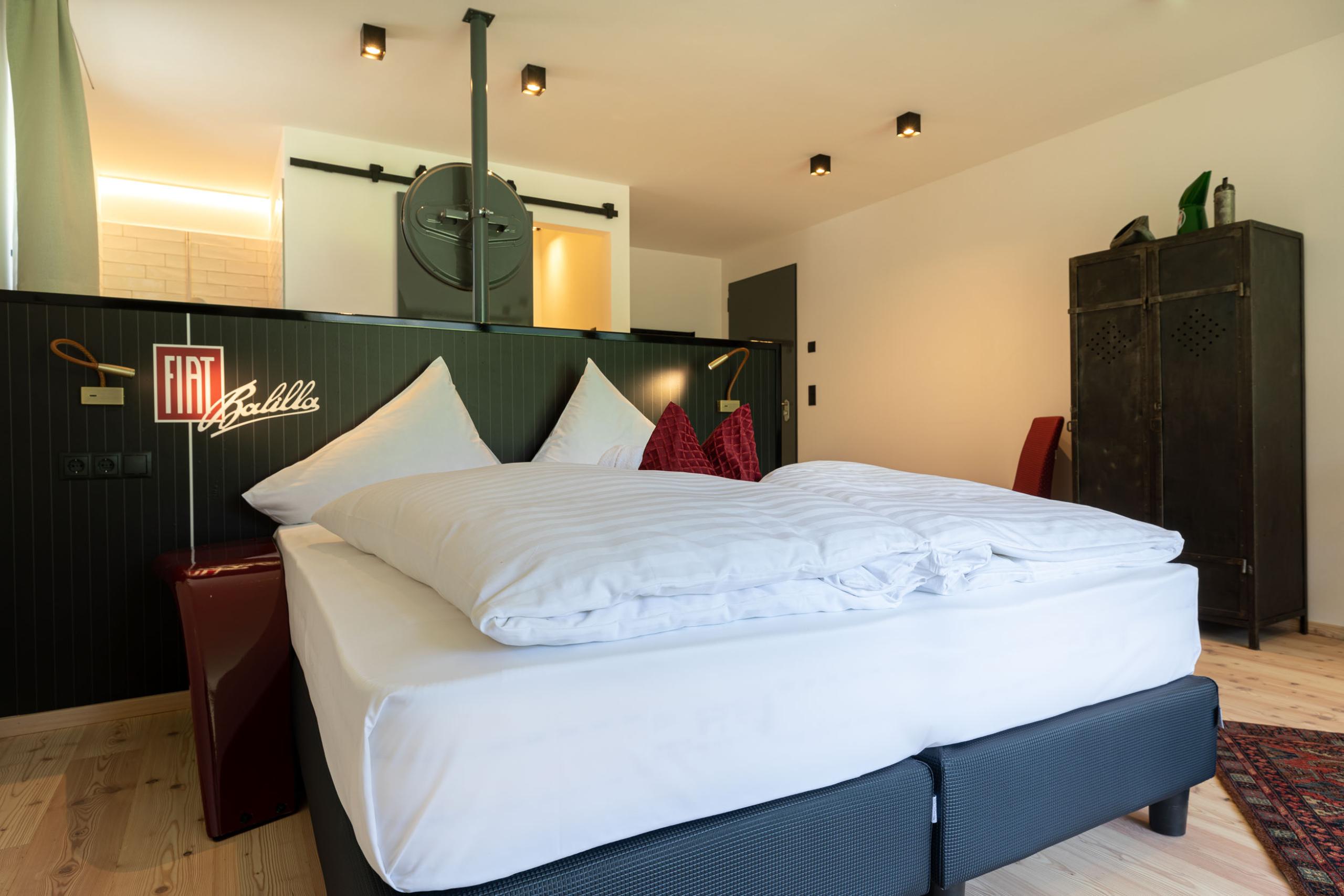 Nella camera Fiat, la dolce vita incontra la passione per i veicoli cult di “Bella Italia”. Immergetevi nell’autentico stile italiano ricreato con parti di carrozzeria di una Fiat Topolino e di una Fiat Campagnola. Due modelli agli antipodi che raccontano alla perfezione la storia dell’iconico marchio automobilistico.