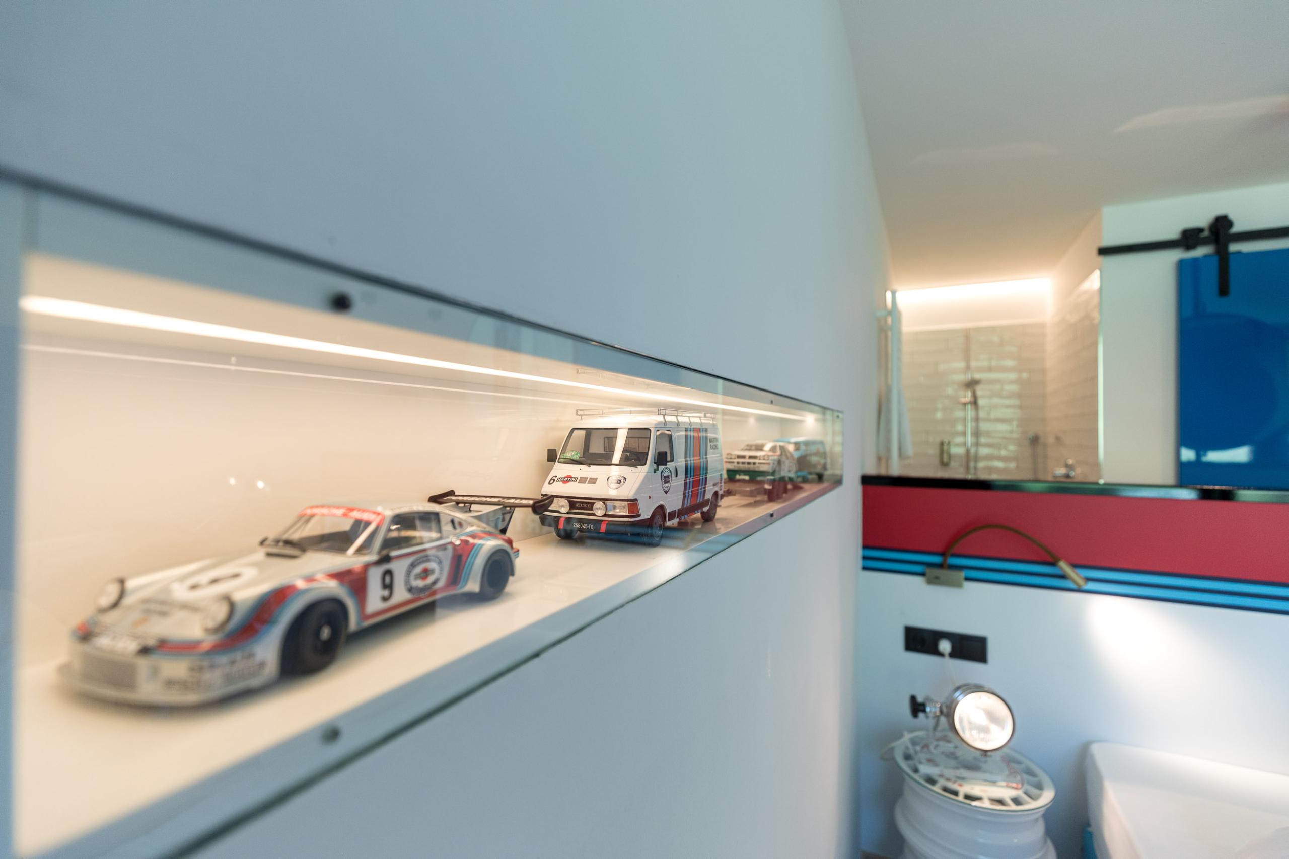 La vostra cabina da piloti personale. Benvenuti nella camera Martini, un capolavoro in blu, rosso e bianco. L’armadio? Ricavato da veri armadietti da piloti. Il comodino? Un pezzo di design creato con cerchioni originali. La lampada da comodino? Un faro d’auto trasformato in un’opera d’arte. Uscire dal letto o restare ad ammirare la collezione di modellini d’auto sulla parete? Ogni mattina lo stesso dilemma!