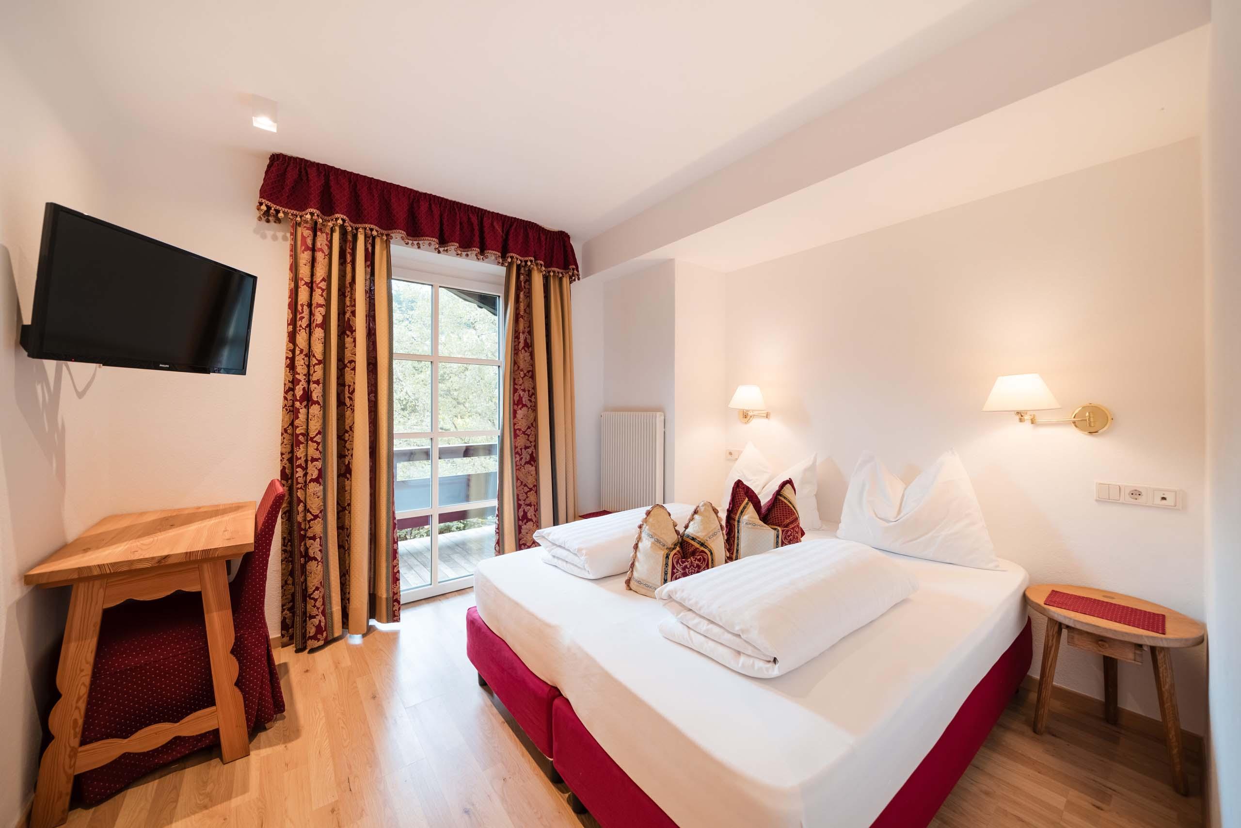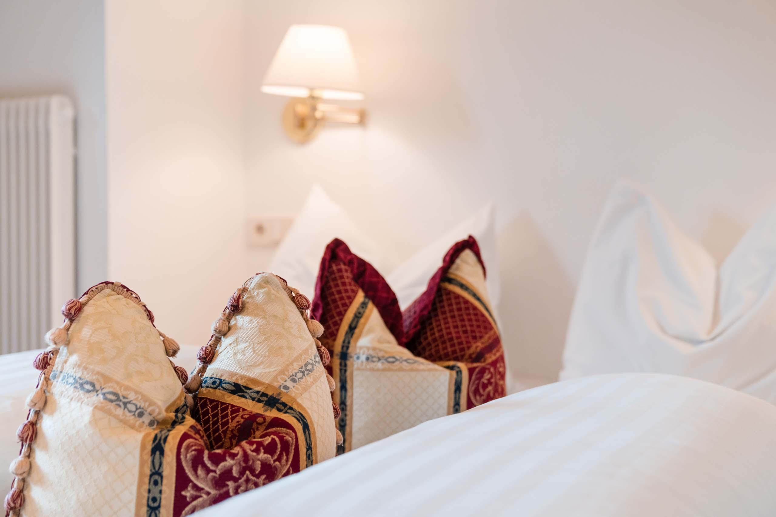 Schlichte, elegante Linie, stilvolle Akzente in Himbeerrot und Gold, höchster Komfort: So behaglich empfängt Sie Ihr Doppelzimmer Basic zu Ihrer Auszeit in den Dolomiten.