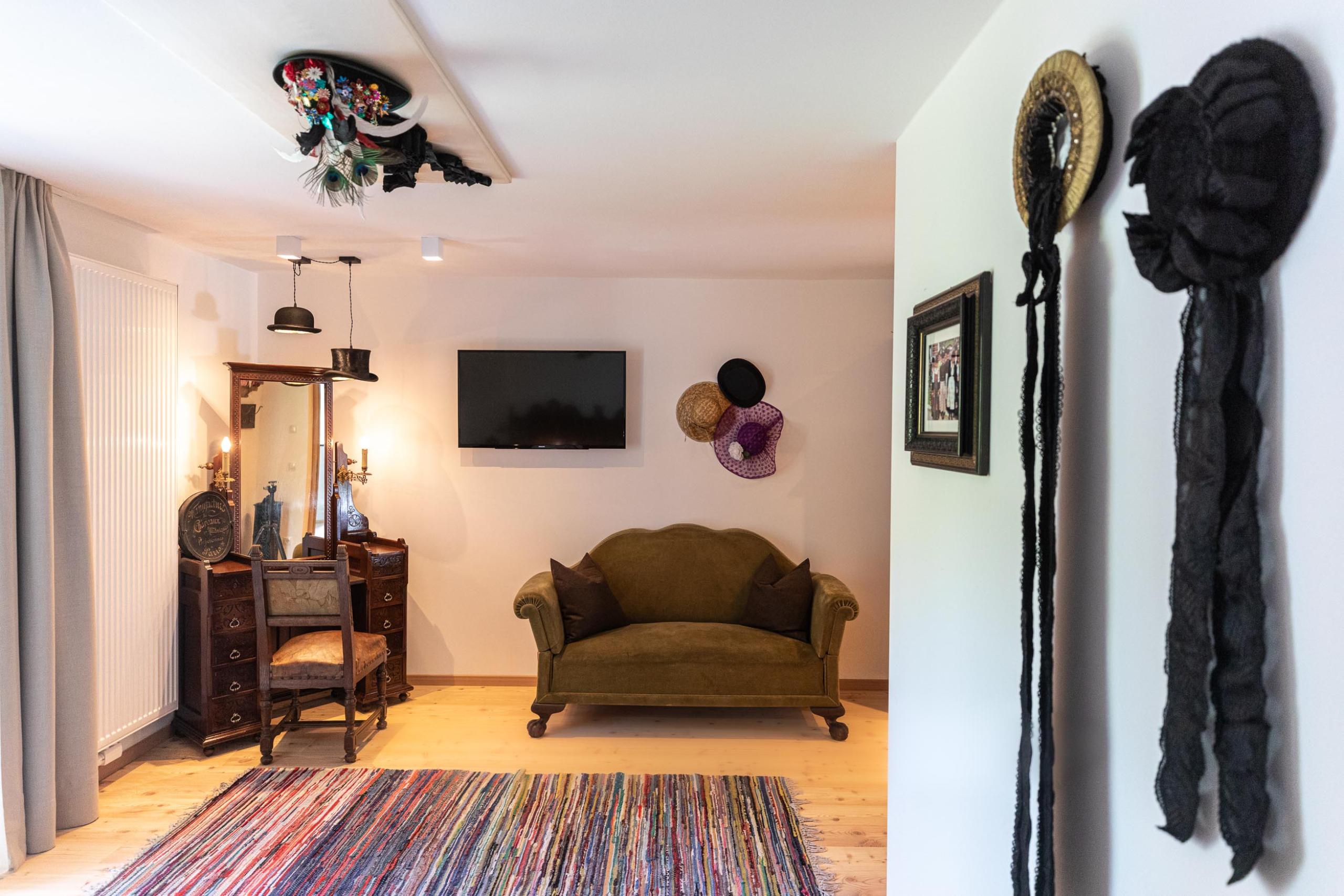 Ein mondäner Hut mit ausladender Krempe auf dem Kopf, und schon fühlt sich das Leben so viel stilvoller und eleganter an. Sie, stylish und extravagant, bei einer Fahrt mit dem Oldtimer. Oder beim Aperitivo-Trinken auf der Piazza. Genau dieses Lebensgefühl erwartet Sie im Hutstübele-Zimmer – mit originellem Mobiliar und verschiedenen Hüten für das gewisse Etwas.